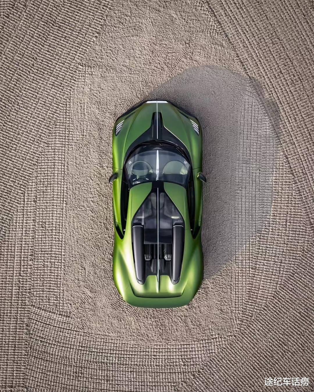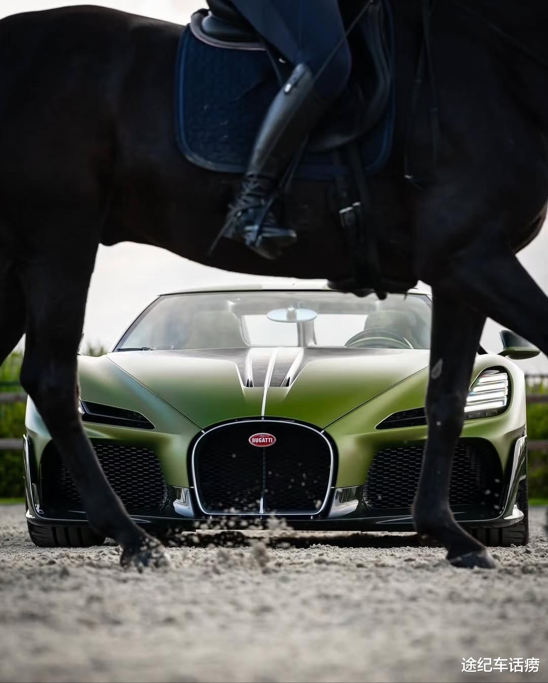 从实车来看,新车基于布加迪 Chiron 架构升级打造,整体造型兼顾气动美学与视觉张力。透明玻璃硬顶搭配深邃墨绿涂装,溜背线条从车头延伸至车尾,宛如晨雾中疾驰的骏马,动感十足。细节处的设计更是处处藏巧:标志性的马蹄形进气格栅、五辐式马蹄纹轮圈,以及车身侧面的 C 形线条,都暗合马的肌肉轮廓与奔跑姿态,将 “马元素” 与机械美学无缝融合,既致敬传统又不失现代感。