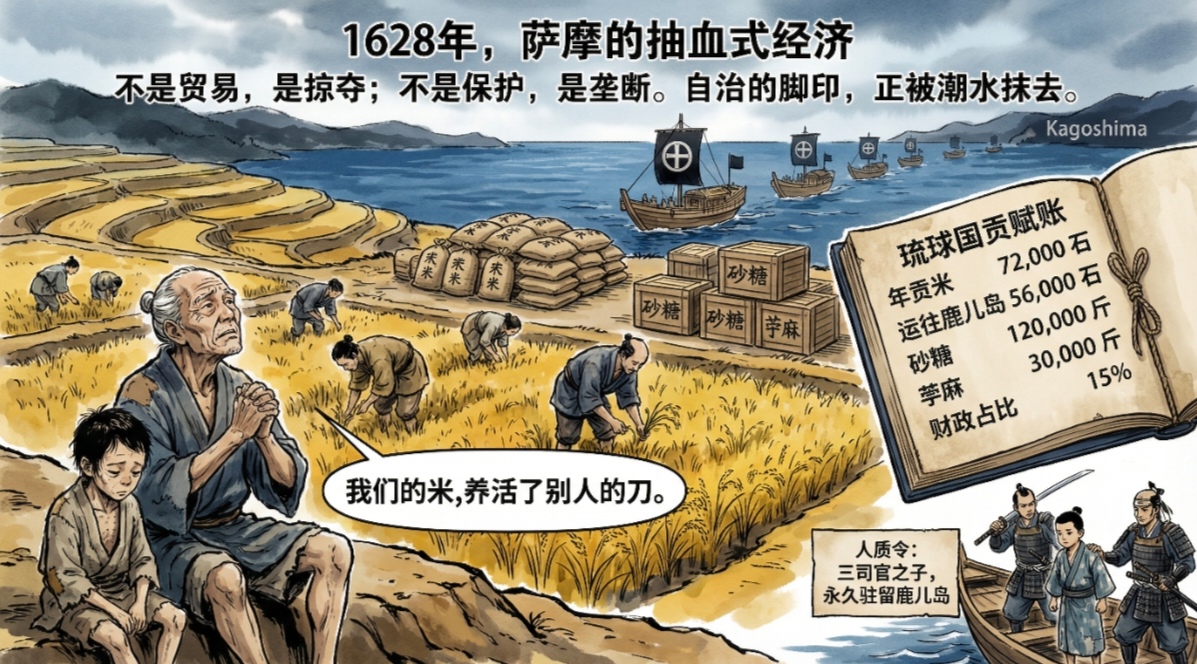 萨摩对琉球开展的经济工程,细致到了石、斤、人等方面,1628年的《琉球国物差帐》有这样的记录,整个岛上的耕地大概有1.2万町步(≈118平方公里),可是却得缴纳年贡米7.2万石,其中5.6万石直接运到鹿儿岛,占到产量的47%。再加上12万斤砂糖以及3万斤苎麻,岛津氏每年净赚大概2.5万两白银,这相当于萨摩藩财政收入的15%,人口更被限制住:1648年人质令规定,琉球三司官的嫡长子必须常驻鹿儿岛,要是违规的话就会被斩首,那霸港就这么被改造成了单向阀门,明朝的商船还能够进港,不过货物清单得先送到鹿儿岛去查看,要是琉球的船想要到南洋去远航,需要持有萨摩发放的渡航印札才行。当地理优势被外部强权变为榨取的中心,琉球的自治空间就如同海滩上的脚印,随着潮汐就消失了。