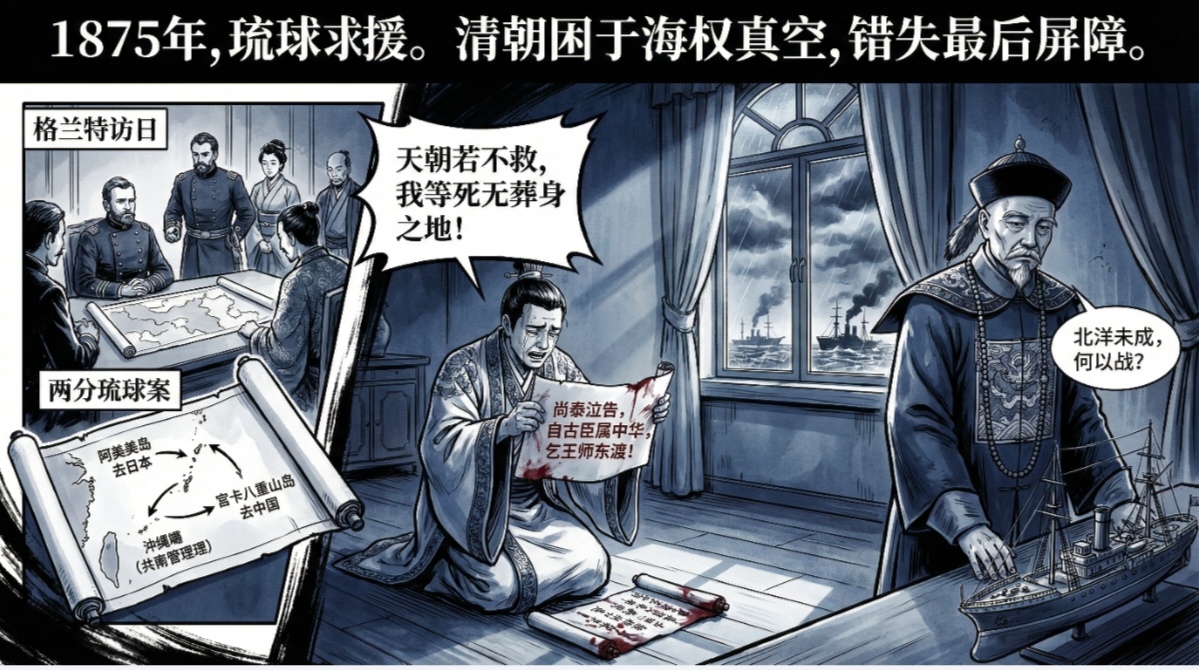 1875年的时候,日本宣布废藩置县,还派兵进驻那霸,琉球王尚泰偷偷派使者到福州,哭着讲自古臣属中国,请求清廷出面,李鸿章心里挺犯难的:要是出兵吧,北洋舰队还没组建完善;要是不管吧,东南那边的屏障就全都没了。总理衙门最后选择在外交层面提出抗议,引用《中日修好条规》里「两国所属邦土,各以礼相待」的内容,期望各国出面来进行调解,1879年,美国提出了两分琉球的方案,北边的奄美归属日本,南边的宫古、八重山归中国,中间的那霸进行共管。