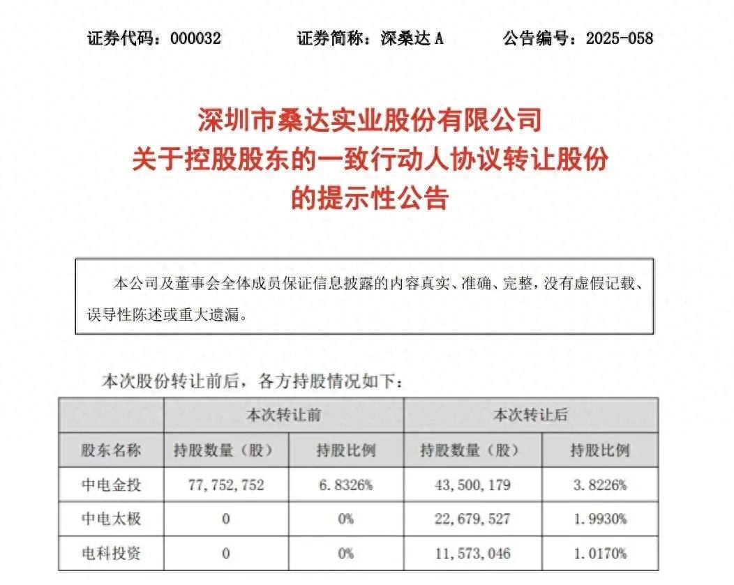 转让完成后,中国电子仍以44.2214%的持股比例保持对深桑达A的实际控制;中国电科通过中电太极、电科投资控制深桑达A3.01%的股份。