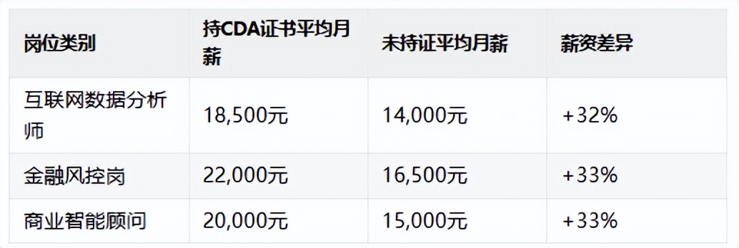 3. 薪资优势显著根据猎聘网2024年数据显示,CDA持证者平均月薪比未持证者高32%(见下表):