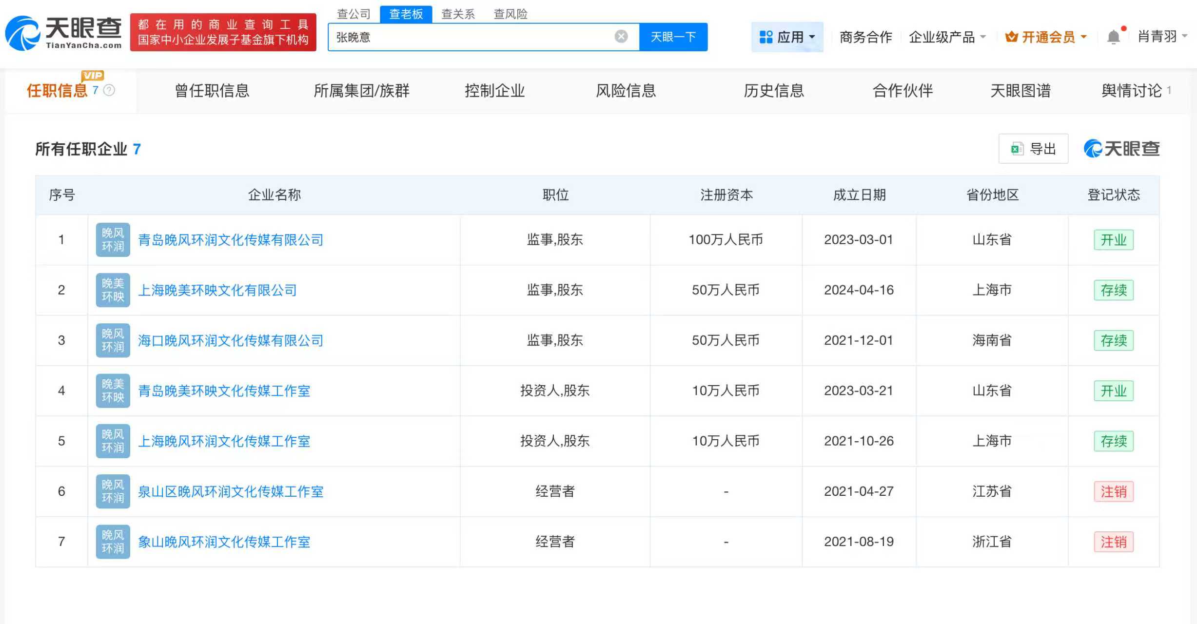 天眼查任职信息显示,张晚意名下关联7家企业,其中5家为存续或开业状态,包括青岛晚风环润文化传媒有限公司、上海晚美环映文化有限公司、海口晚风环润文化传媒有限公司等。张晚意在上述企业中担任监事、股东等职务。