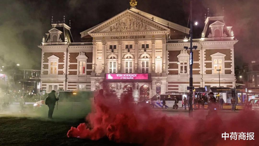 在阿姆斯特丹音乐厅举行的一场示威活动中,亲巴勒斯坦的抗议者燃放了烟雾弹。警方共拘捕了22人,其中部分原因是持有烟花爆竹。