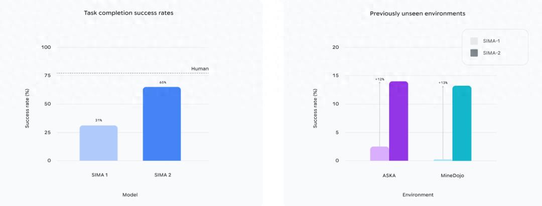 在从未训练过的 MineDojo(Minecraft 的研究实现版本)和 ASKA 游戏中,SIMA 2 的成功率相较第一代分别提升了 13% 和 12%。虽然仍然只有不到 15% 的水平,但考虑到智能体此前从未见过这些游戏的任何画面或机制,这个表现已经相对可观。
