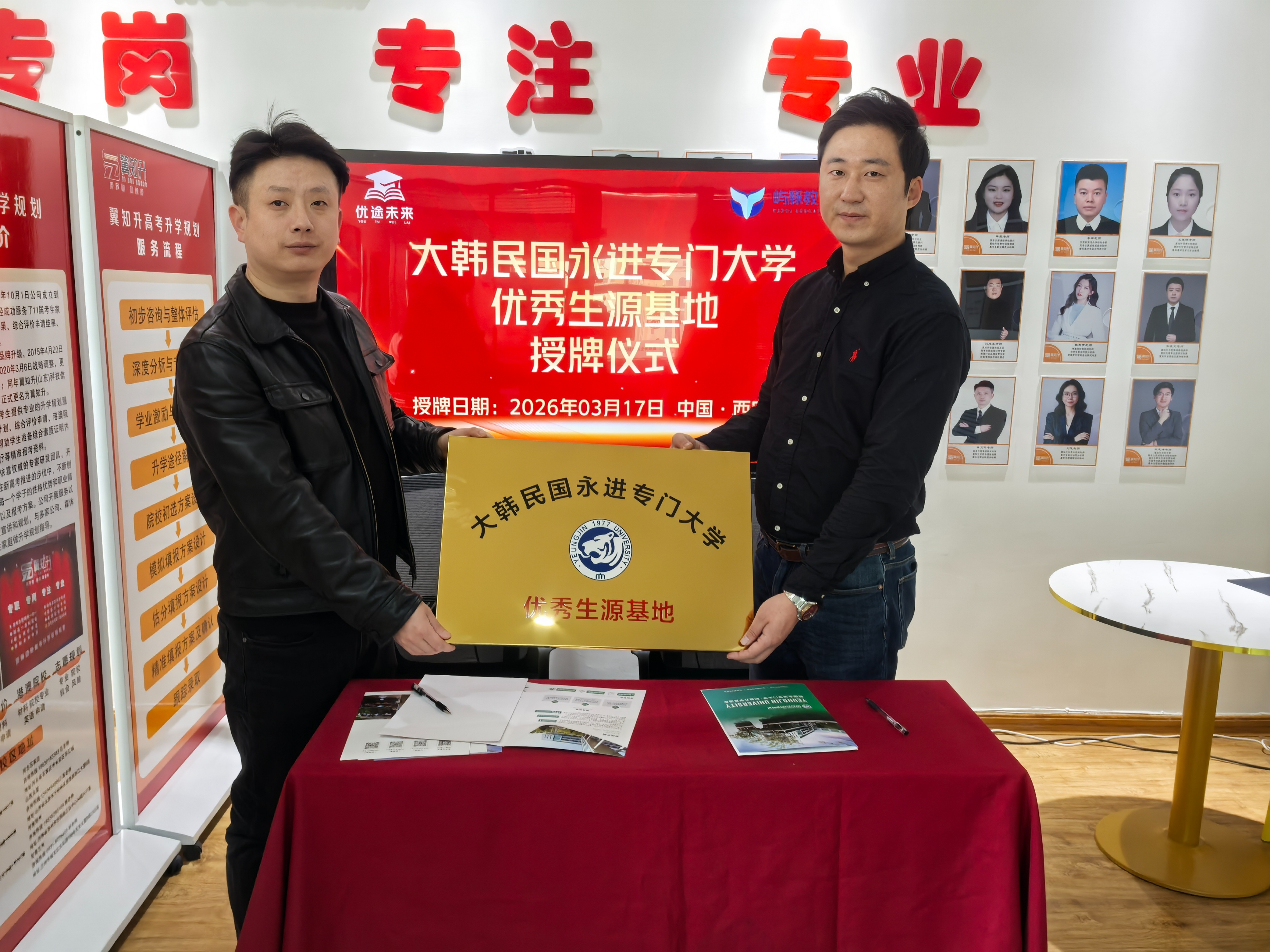 自此,优途未来教育集团成为两所韩国高校在陕西的官方合作生源基地,承担起优质生源的选拔、推荐及前置培养工作。屿豚教育作为忠北大学西南地区入学指导中心、永进大学官方招生代表,全程主导此次授牌并建立深度合作机制。