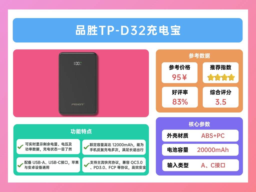 品胜充电宝凭借丰富渠道经验与稳健技术,20000mAh大容量支持多设备同时充电,LED数码显示清晰,PD20W与QC快充兼容,是学生和重度用电用户的实用首选。