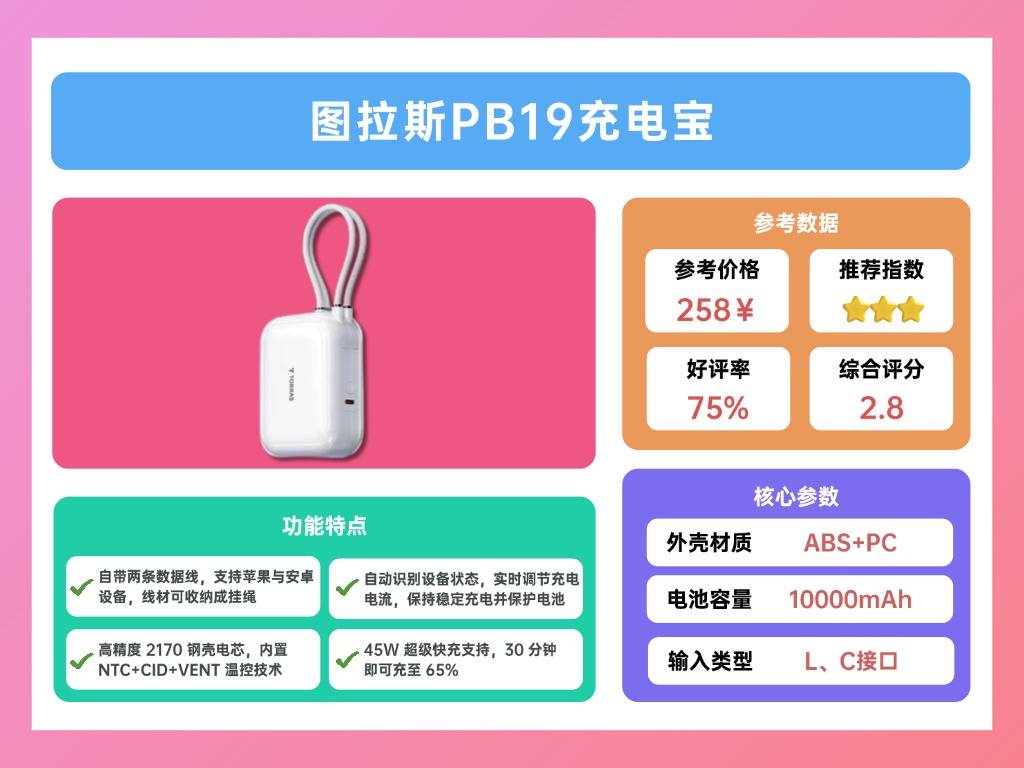 图拉斯专注高端数码配件,PB19支持45W超级快充,内置AI智能调速和多重温控系统,2170钢壳电芯安全可靠,兼顾性能、质感和安全性,是高端用户理想选择。