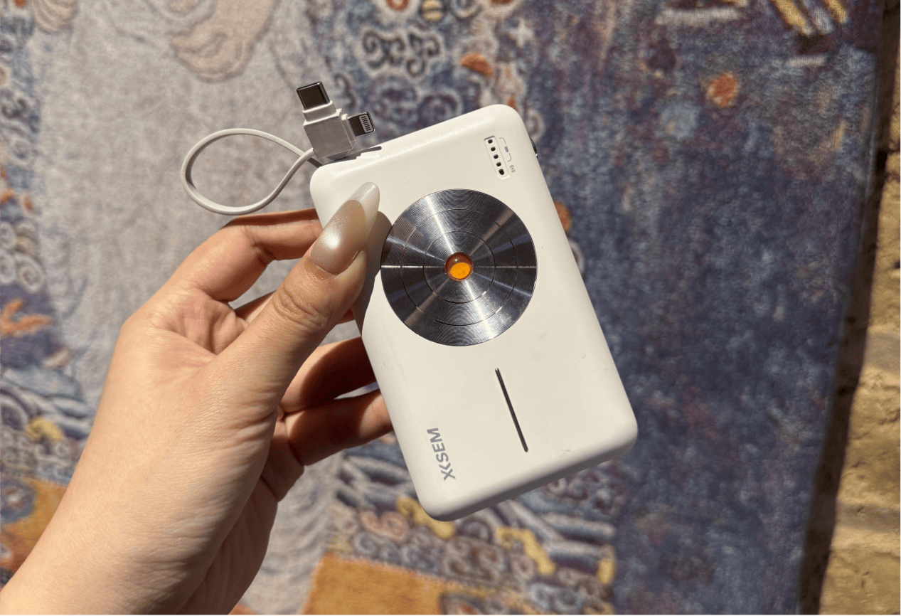 外观圆润,大小接近银行卡,重量只有 180g,拿在手里几乎没负担。还自带 Lightning 与 Type-C 双线,充什么设备都方便。10000mAh 容量、6000mAh 额定输出,支持 22.5W SCP 超级快充。电量数字显示清晰,四色可选。整体表现均衡,尤其适合追求便携与颜值兼顾的用户。