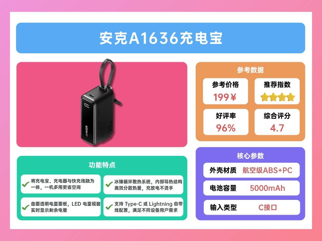 外观依旧延续安克一贯的高完成度,五种配色清爽耐看,侧边的曲面面板光滑顺手,LED 电量窗能直观显示剩余电量,用起来挺智能。不过它的容量偏小,仅 5000mAh(额定 3000mAh),输出功率最大 7.5W,更适合应急补电。价格接近 200 元,对追求便携和一体化设计的人来说值得考虑,但不算性价比路线。
