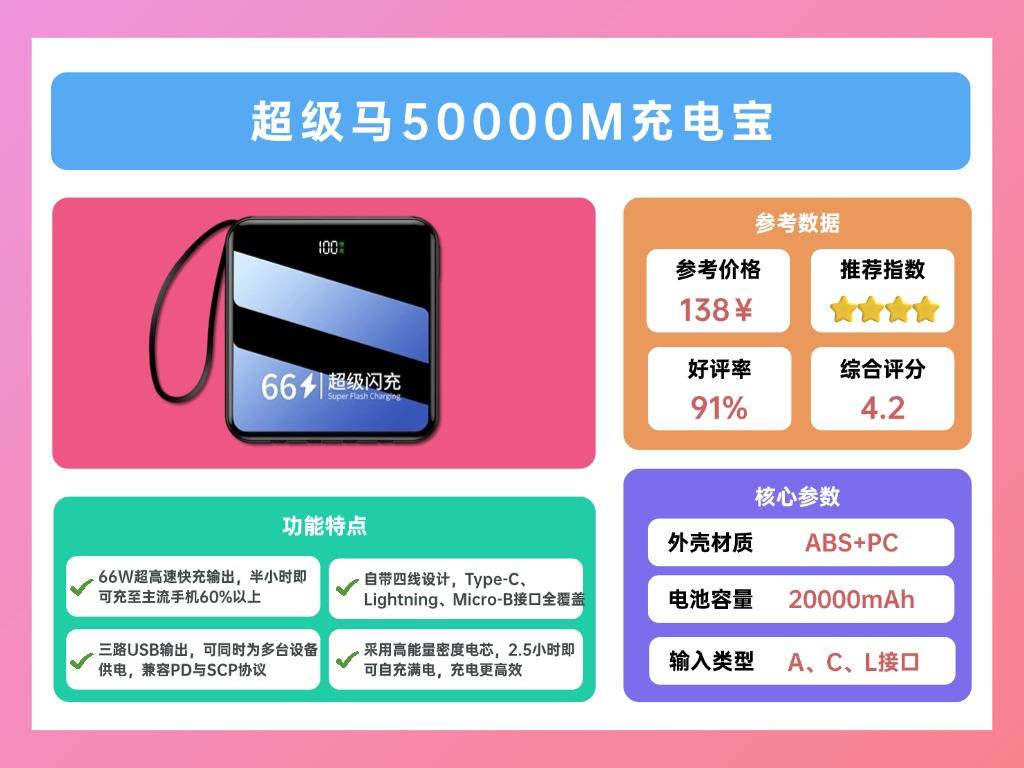 超级马专注大容量和多口快充,支持PD、SCP、QC协议,功率高达66W,兼容性广,性价比优异,是重度用电和出差用户青睐的品牌。