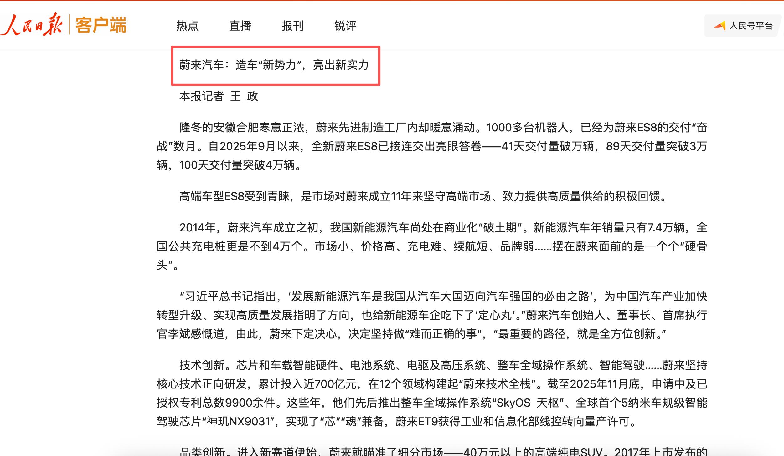 近期,蔚来在央视等国家级媒体平台上的曝光度显著增加。从报道其全栈技术成果,到深入安徽产业一线的专题剖析,这种高规格、多维度的关注,已远超对一个成功企业的常规商业报道。就在前不久,《人民日报》还以“三个三千万”为题,全景扫描中国汽车产业的强劲实力权威深度报道,并以蔚来汽车为典型样本,给出了“全方位创新驱动高质量发展”的答案。其背后,是央媒将蔚来视为观察中国汽车产业乃至高端制造业转型升级的一个关键“标志性样本”。透过蔚来,央媒试图向公众阐述一场深刻的产业变革。