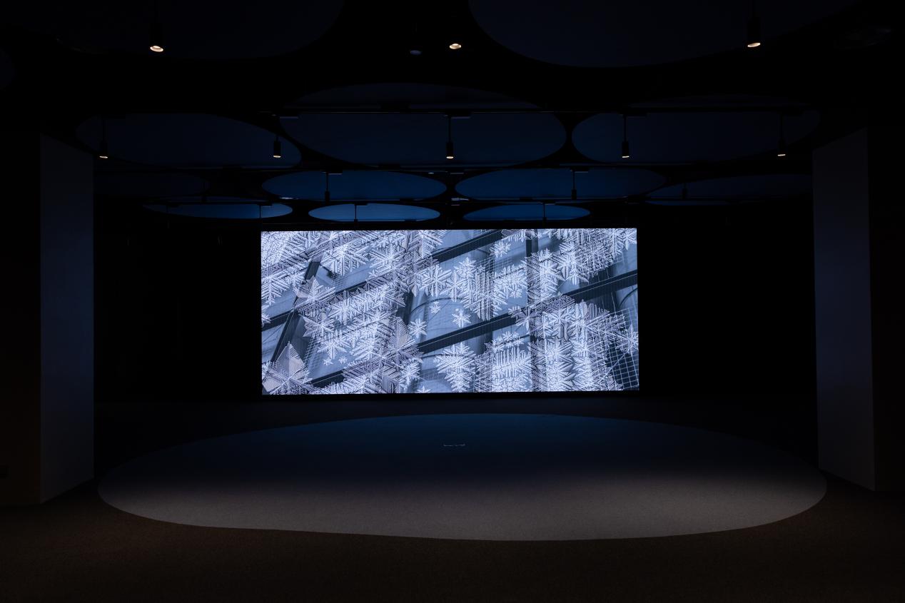 算力剧场展示了他的作品《雪花谱》。在《雪花谱》中,像素通过元胞自动机的程序运作,以六边形晶格结构排列,演化出不断变化的明暗图像,反映着该设施里面背景图像的亮度、暗度和颜色,混乱且难以预测。雪花具有六边形的晶格结构,但雪花形成的整个过程在当代自然科学中未被完全解读,这也唤起了另一种关于算法的想象:“计算”本身,即构世本源。