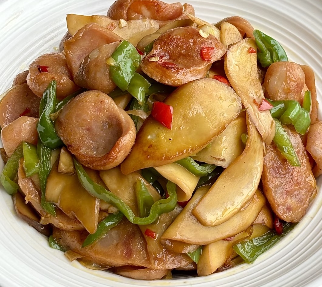 这盘菜其实是我“搬家第一顿”。三年前,我拎着行李箱冲进出租屋,冰箱空空,只剩前房客留下的半包香肠和两根快蔫的杏鲍菇。那天屋外下着暴雨,我穿着湿袜子站在灶台前,胡乱把它们炒在一起,端上桌才发现:哇,居然好吃到想哭。后来每次工作受挫、失恋、赶稿到凌晨,我就做这盘菜,十分钟出锅,一口下去,雨声、键盘声、地铁轰鸣声全都静音,世界只剩“咔嚓咔嚓”的咀嚼声——像给灵魂按了重启键。朋友说它是“贫民安慰剂”,我却觉得更像深夜食堂里的“老板特制”,简单、热乎、对味。