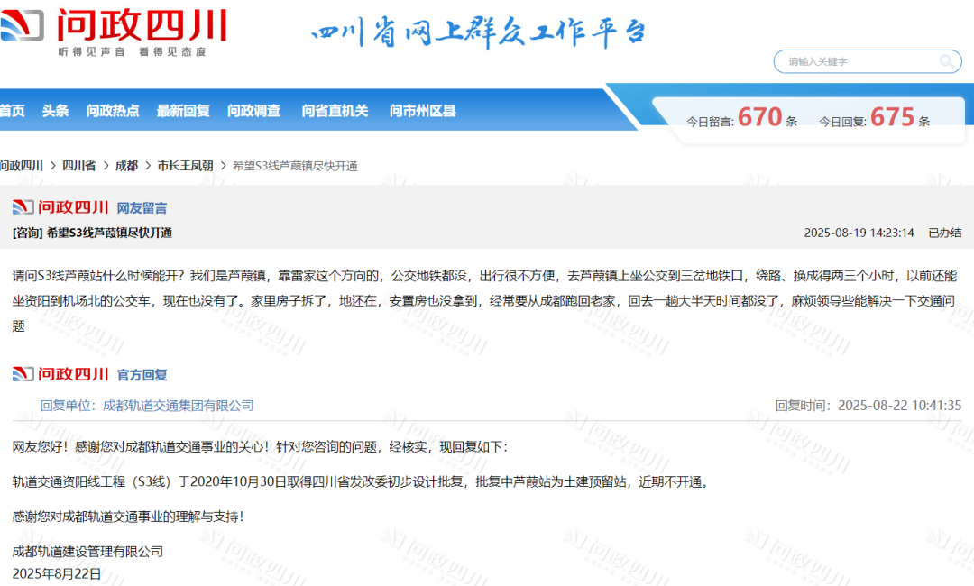 该线路已于2021年12月纳入国家相关规划,并于2023年3月启动前期招标,原定于同年开工,但目前尚未进入实质施工阶段。今年以来,仅“问政四川”平台上关于S13线开工时间及延期原因的市民留言已超过30条,反映出公众对项目进展的高度关注。