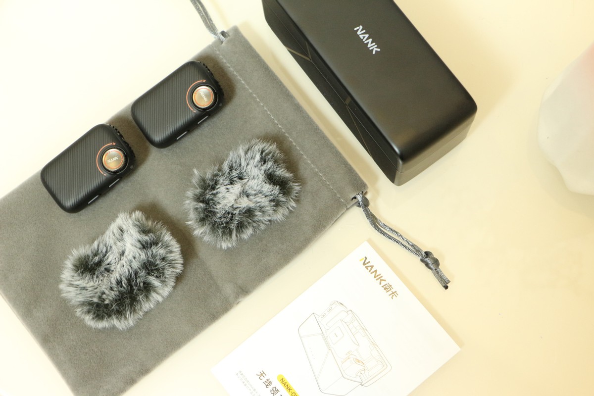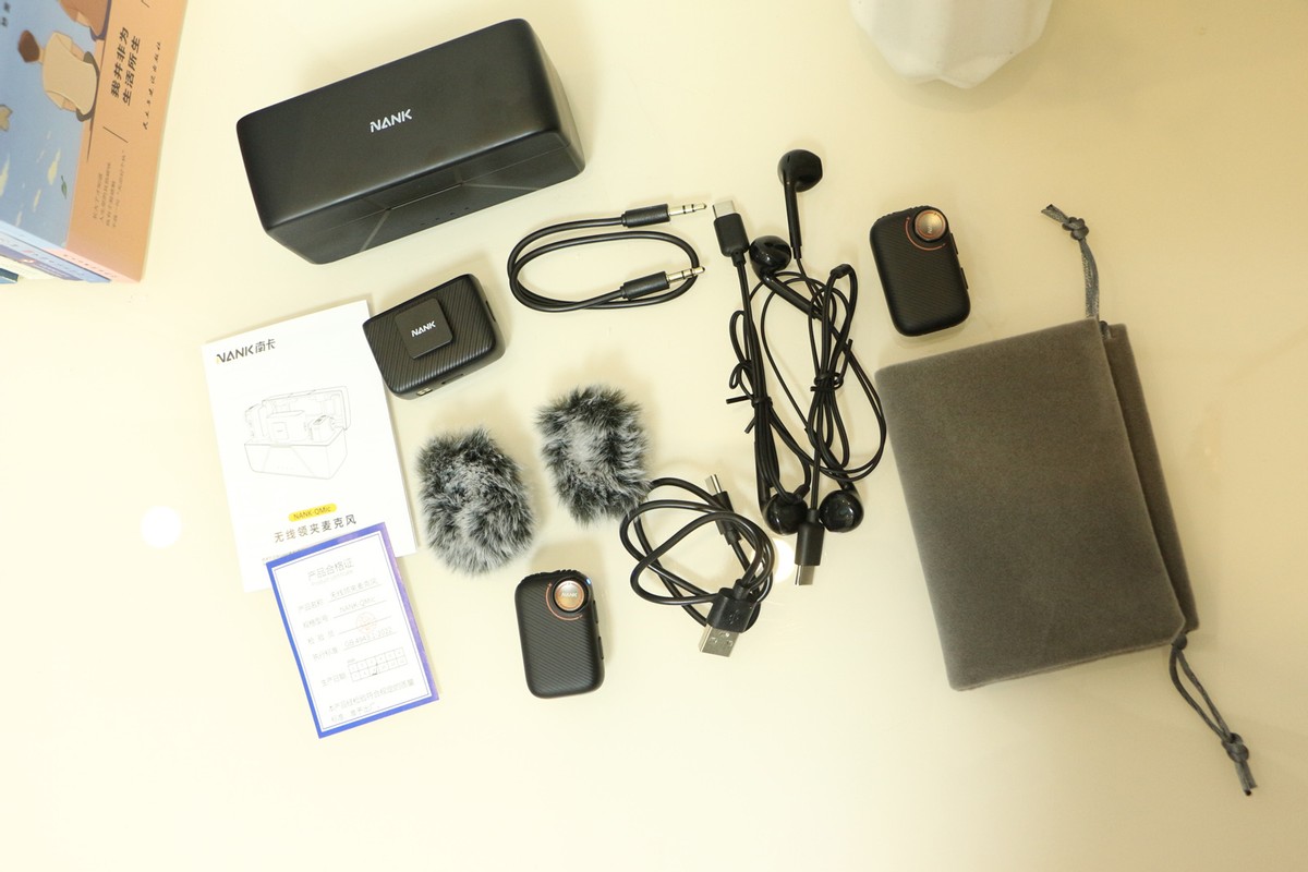 发射器、接收器、毛绒防风罩、充电线、连接线、耳机以及说明书、收纳袋等,一应俱全。