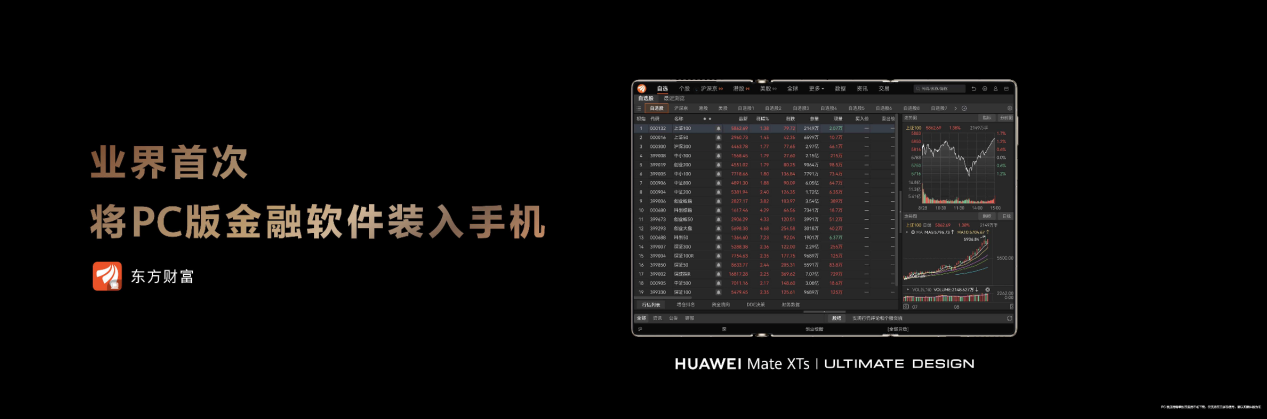 当然,三折叠真正的核心是大屏体验。华为Mate XTs 非凡大师搭载10.2英寸大屏,不仅可以满足超大屏娱乐需求,还能拥有看齐“PC”的生产力。譬如全新自由多窗的窗口大小可自由调整,支持三应用同时运行,还能像PC一样实现应用间的文件拖拽。更厉害的是,华为这次直接把PC端应用“搬”了过来,WIND金融终端、东方财富、PC版WPS都实现完整适配。