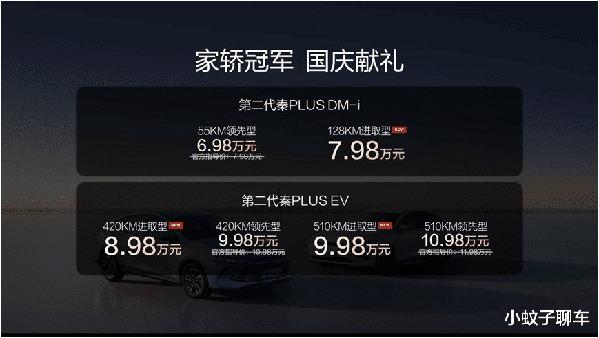 9月25日,比亚迪第二代秦PLUS双车上新,发布了秦PLUS DM-i 128KM进取型、秦PLUS EV 420进取型、510KM进取型共三款新车,同时全系车型享国庆献礼价,限时6.98万元起。