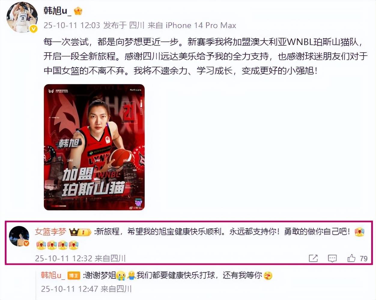 韩旭在个人社交平台上写道:“新赛季我将加盟澳大利亚WNBL珀斯山猫队,开启一段全新旅程。我将不遗余力、学习成长,变成更好的小强旭!”