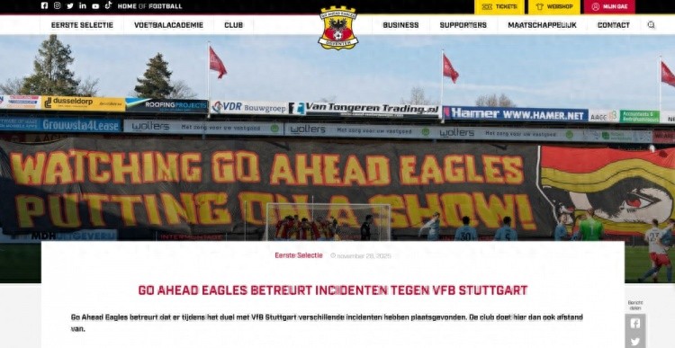 荷甲球队前进之鹰俱乐部官方对与斯图加特比赛中的不当行为表示歉意。