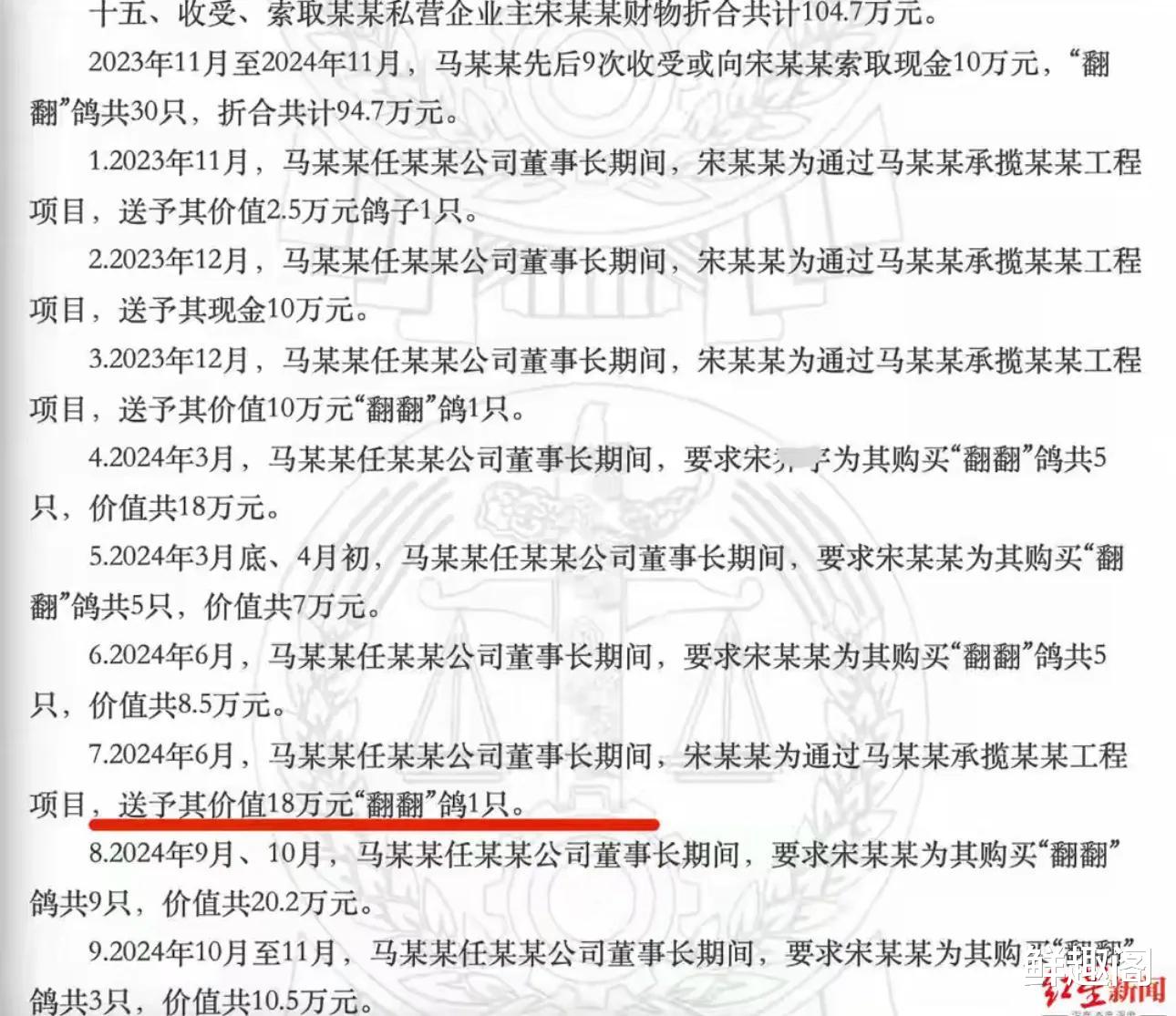 其中最昂贵的一只鸽子价值高达18万元,马某某的收鸽子的频率呈逐年上升趋势。2021年他只收受3只,2022年增至8只,到2023年竟然暴增至56只,2024年虽然有所回落,但仍然收受了28只。