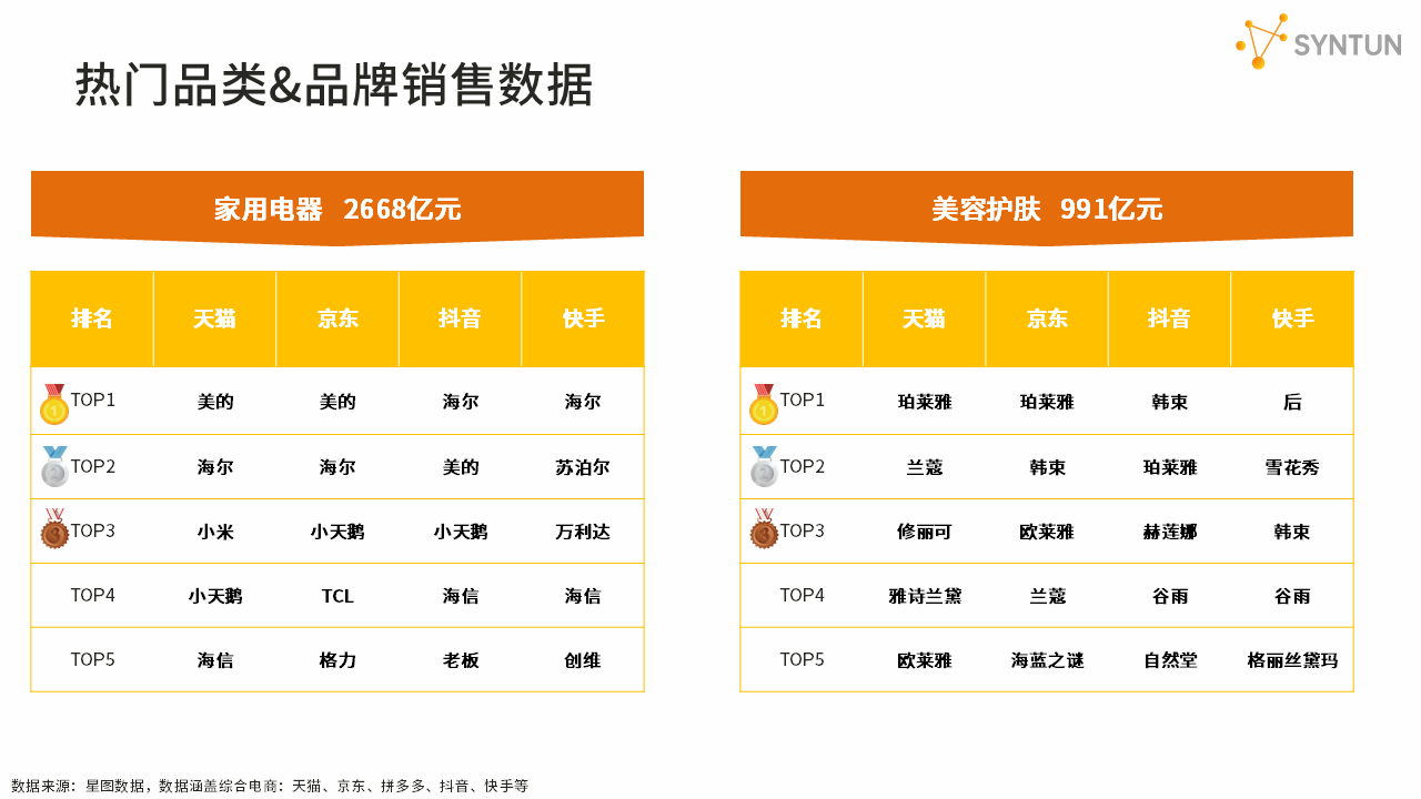 热门销售品类中,家用电器为2668亿元,美容护肤991亿元,洗护清洁444亿元,粮油调味为397亿元,香水彩妆334亿元,营养保健为238亿元,休闲零食171亿元,宠物食品94亿。