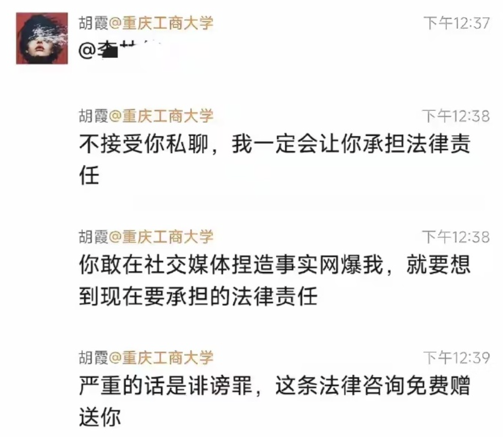 但胡霞教授不接受私聊,她说:“你敢在社交媒体捏造事实网暴老师,就要想到你要承担的法律责任。严重的话,就是诽谤罪,这条法律咨询免费送给你。”