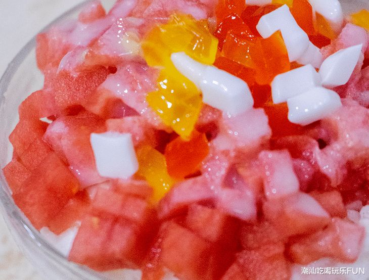 芒果金灿灿,西瓜水汪汪,叠在雪白冰沙上像打翻的调色盘。炼乳缓缓渗入冰隙的瞬间,吃货的心都在颤抖。