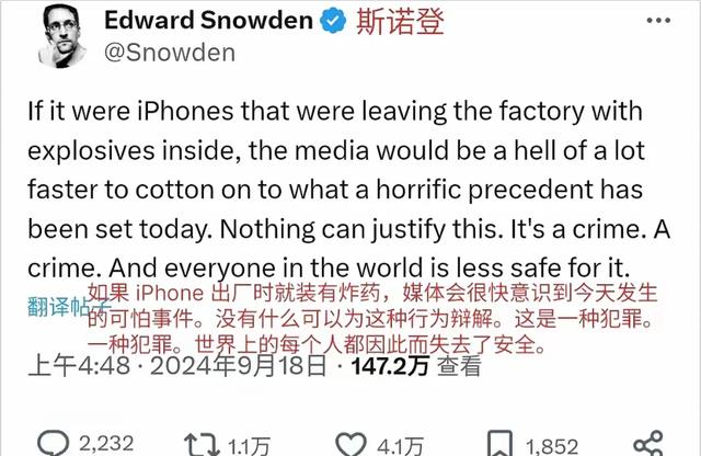 著名揭密者斯诺登在社交平台上发声,警告人们不要掉以轻心。