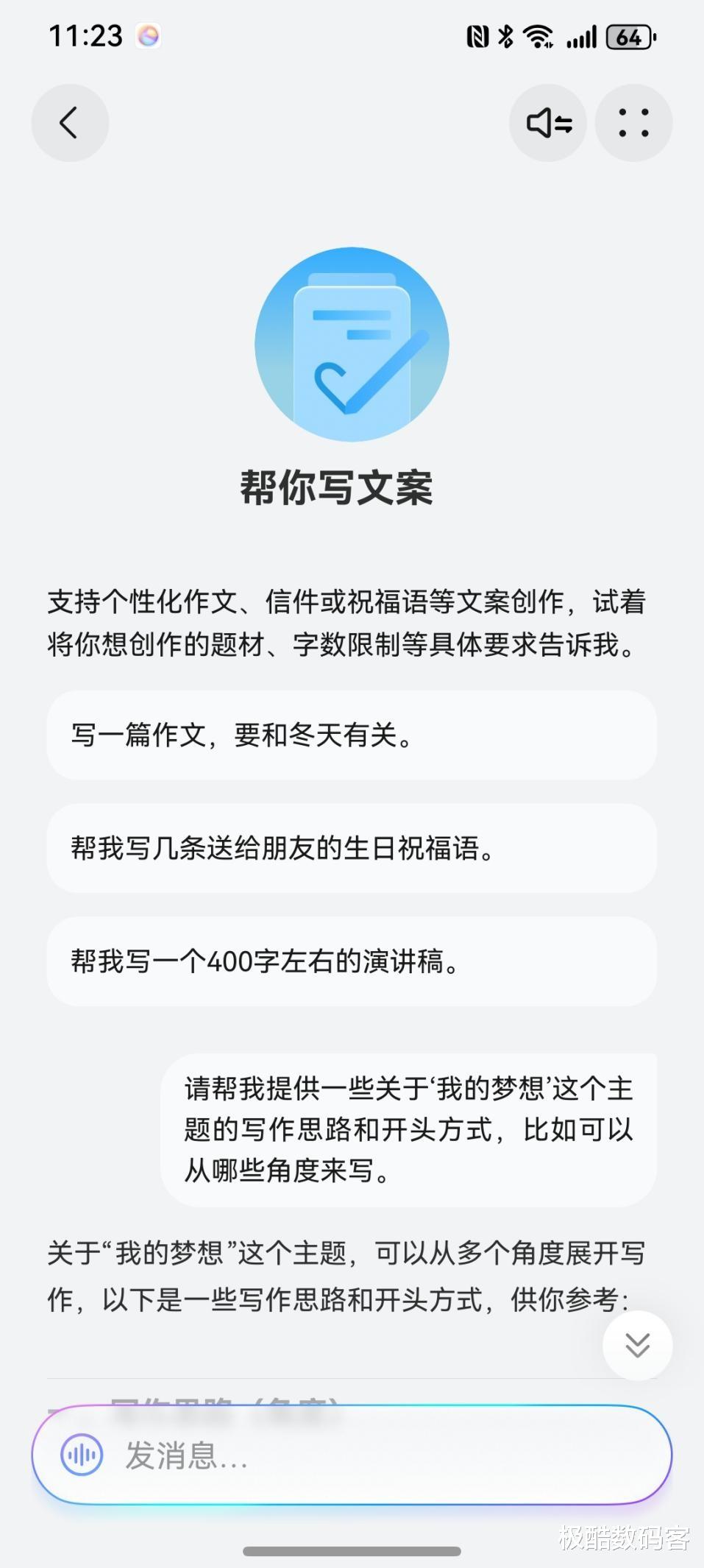 上个周末,老师要求写一篇关于“我的梦想”的作文,400字。果不其然,孩子又卡壳了。看着他愁眉苦脸的样子,我决定换个思路,用搭载鸿蒙5的nova 14来帮忙。我打开小艺App,进入“发现”里的智能体市场,找到了“帮你写文案Agent”,并将需求发给它——“请帮我提供一些关于‘我的梦想’这个主题的写作思路和开头方式,比如可以从哪些角度来写。”
