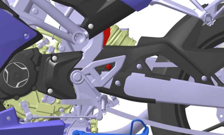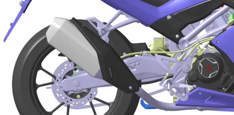看完整体轮廓,再抠细节,当然有惊喜,也有遗憾。首先车身包围与发动机部分,它的侧包围比普通仿赛少很多,发动机和内部结构大面积裸露,应该是想营造机械感与视觉冲击力,但从专利图来看,发动机造型并不饱满,内部空隙较大,裸露后反而显得车身有些单薄,少了预想中的肌肉感,这算是小小设计遗憾。不过前倾角似乎偏大,但也强化了标准街跑的骑行姿态,能兼顾日常骑行的舒适与轻度运动的乐趣。