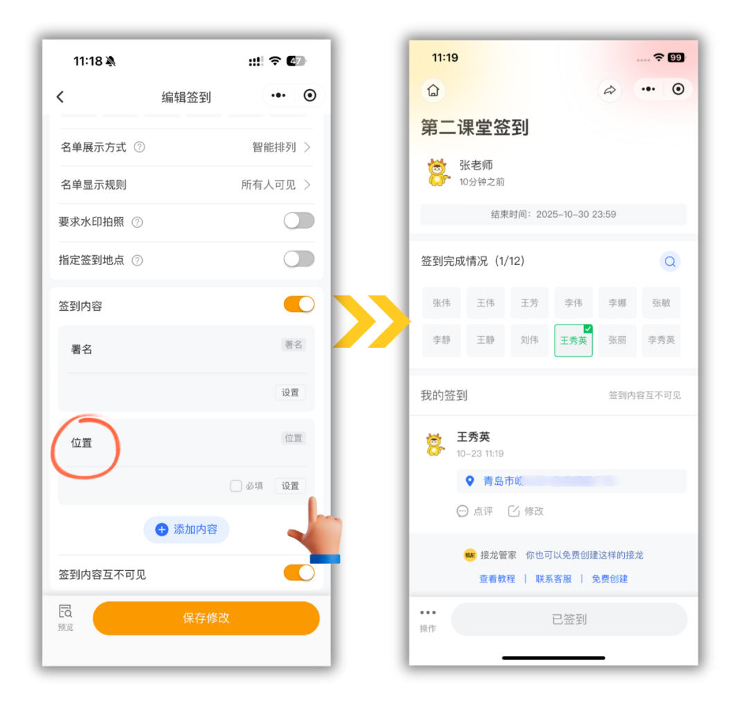 学生只有到达指定位置才能签到,否则提示“不在可接龙范围内”而无法签到,确保本人到场。