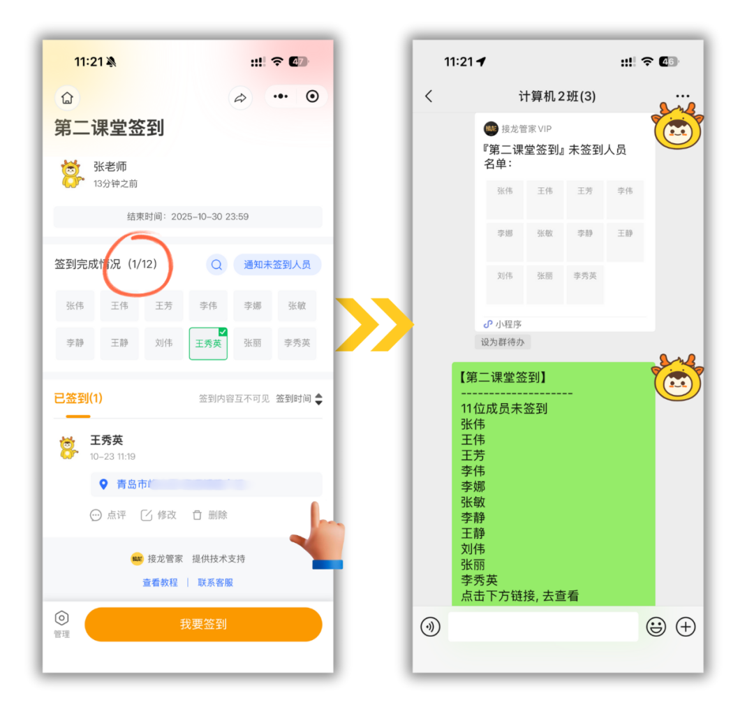 开启按名单签到,发布人可以实时查看签到进度,未签到的同学可一键发送提醒,不用手动@全员。