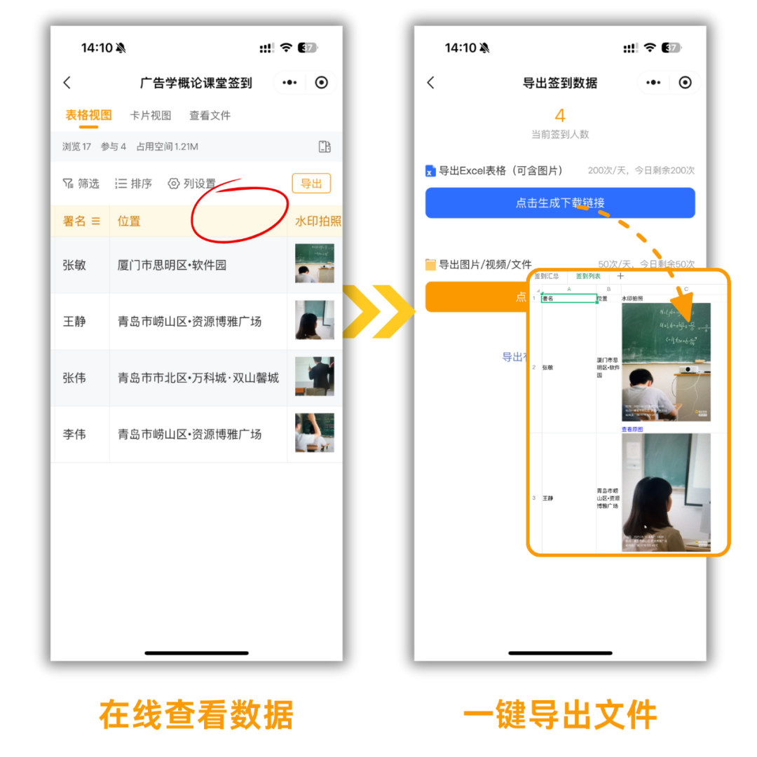 对于签到/签退数据,发布人可随时导出表格,支持表格含图片,轻松汇总第二课堂的活动签到签退情况,无需熬夜手动整理,解放双手!