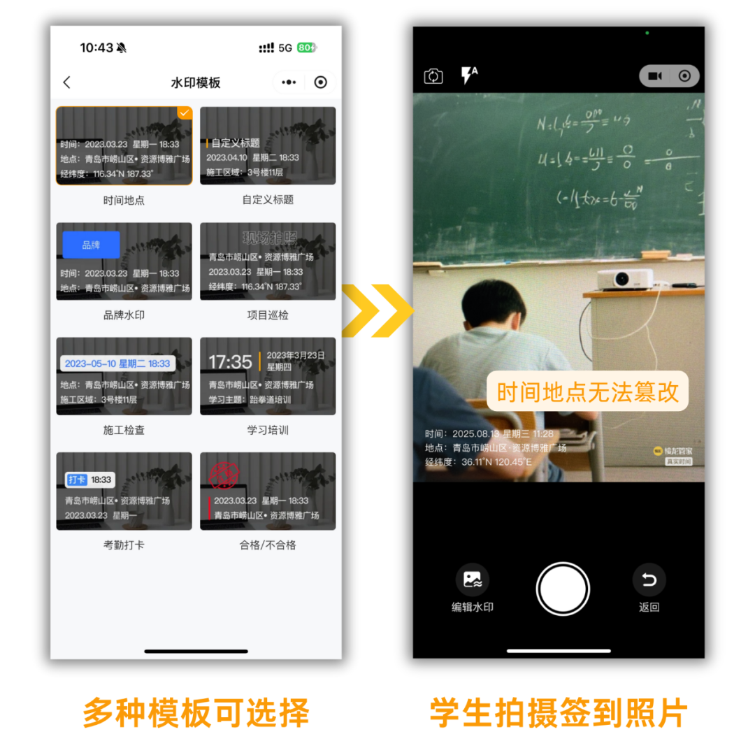 开启水印拍照,可让同学拍摄到场照片,系统自动获取时间、地点水印,添加在拍摄照片上,学生无法修改,避免代拍摄照片等行为,让签到更真实。