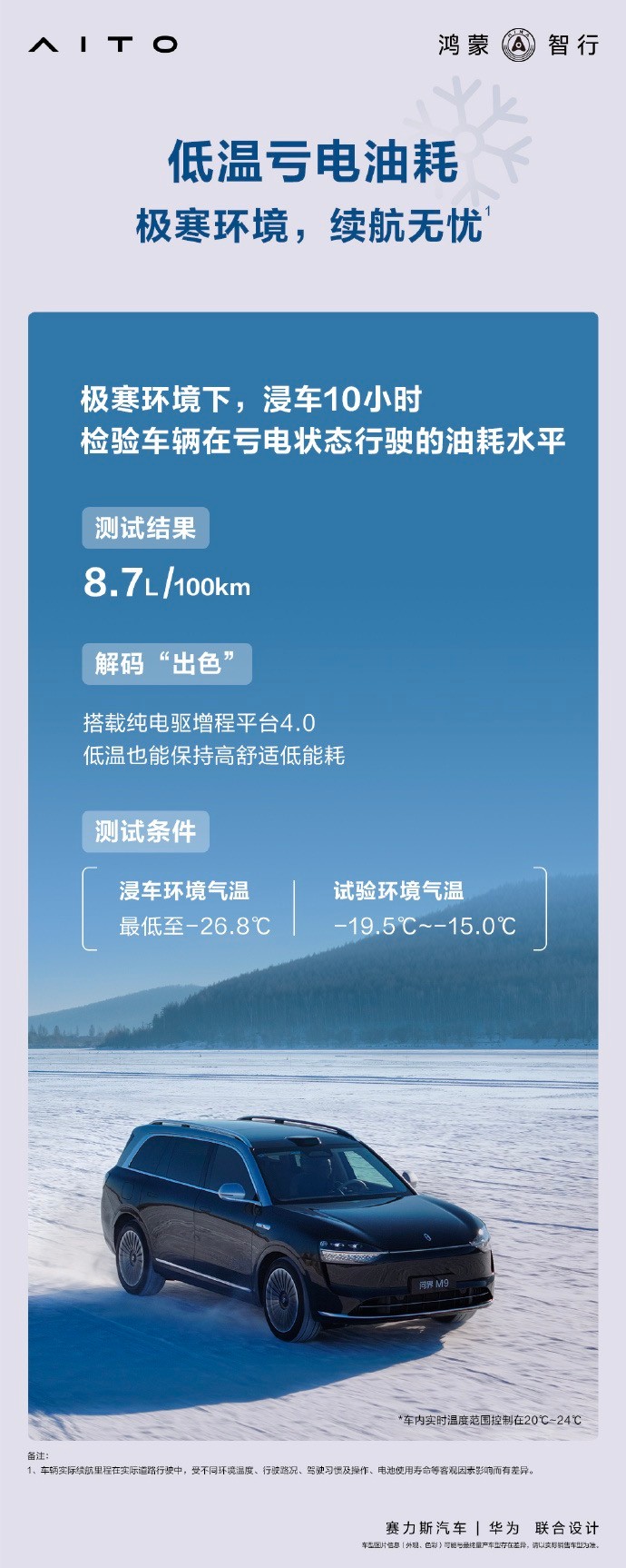 针对消费者普遍关注的新能源车冬季续航问题,问界M9也给出了令人满意的答案。在极寒环境的严苛测试中,问界M9浸车10小时后,其低温亏电油耗仅为8.7L/100km,这一数据充分展示了其先进的能源管理系统和高效的热效率。得益于华为DriveONE纯电驱增程平台4.0的加持,问界M9在低温环境下依然能够保持高舒适度与低能耗的完美结合,无论是日常通勤还是长途跋涉,都能游刃有余。