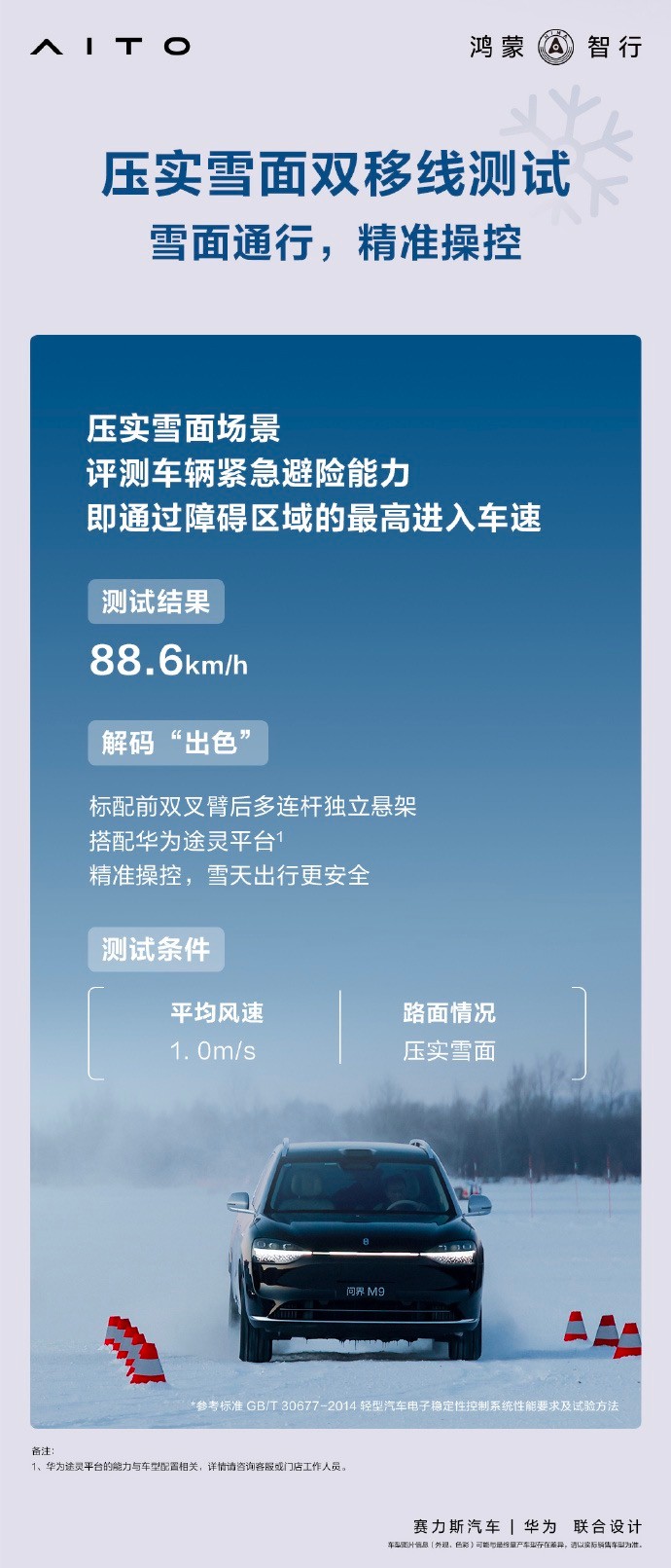 在压实雪面双移线测试中,问界M9以高达88.6km/h的速度稳健通过,展现了其出色的操控性和稳定性。同时,在对开坡道起步测试中,问界M9也轻松应对,彰显了其强大的动力性能和爬坡能力。这些优异表现的背后,离不开问界M9搭载的华为途灵平台。该平台下的HUAWEI DATS动态自适应扭矩系统,能够精准控制电机扭矩,智能调节动力输出,有效应对冰雪路面的打滑现象。而HUAWEI XMOTION智能车身协同控制系统,则进一步提升了车辆在复杂场景下的安全性、操控性和舒适性。