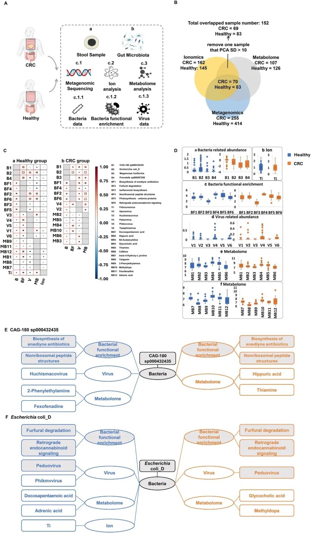 研究团队收集了152份粪便样本(来自83名健康志愿者和69名CRC患者),开展肠道宏基因组、代谢组及离子组(金属离子)的多组学分析。通过生物信息学方法筛选出关键特征。研究核心基于Python平台构建结构方程模型,分别以关键菌种为中心节点,系统解析了健康组与CRC组中微生物、代谢物、离子以及细菌功能之间的复杂因果关系网络。