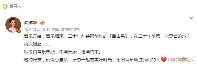 龚丽娜在发文中写道:“音乐开始,音乐结束。二十年前共同创作的《自由鸟》,在二十年前第一次登台的地方再次唱起……姻缘由音乐牵线,中国开始,德国结束。邀约好友,说说心里话,感恩一起的美好时光,谢谢曾帮助过我们的人”