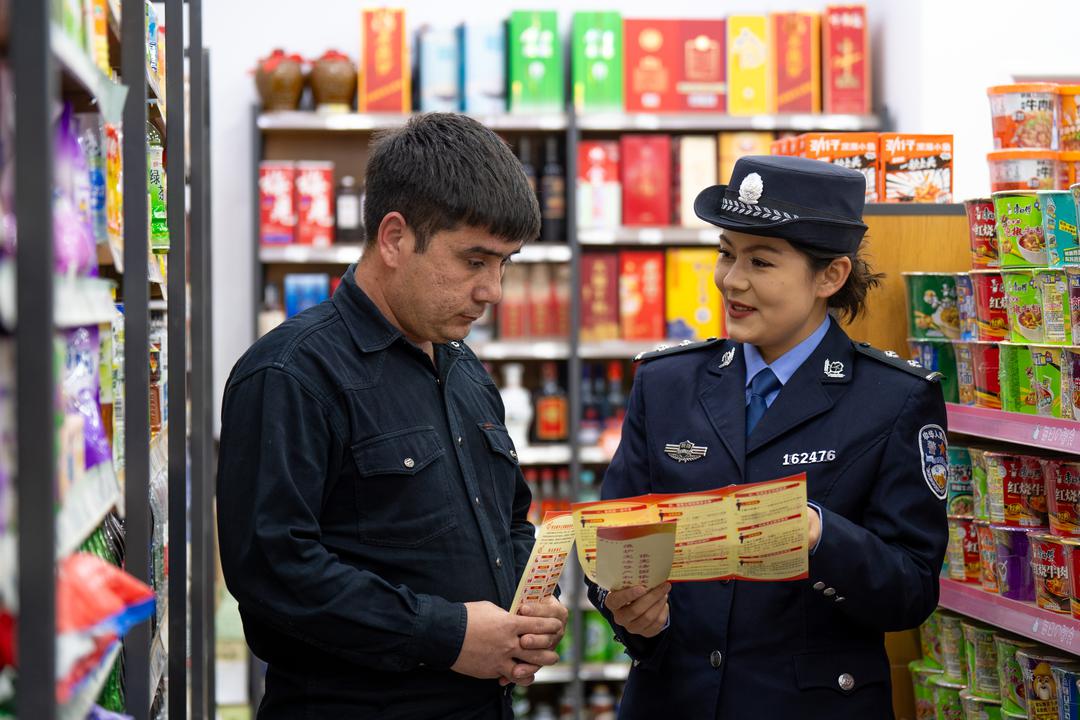 在商业街,民警逐户走进餐馆、超市、便利店等经营场所,向商户和过往群众宣传宪法中关于市场经营、安全生产、消费者权益保护等方面的法律规定。“老板,您进货时一定要留存好票据,这是维护自身合法权益的重要凭证,要是遇到消费纠纷,还可以拨打12315投诉热线。”民警对商户买买提明·吾斯曼说道。