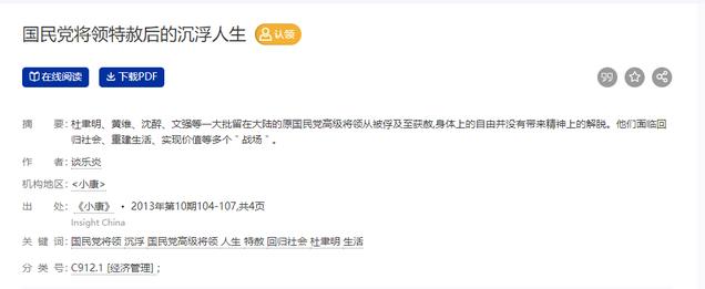 参考资料:[1]谈乐炎.国民党将领特赦后的沉浮人生[J].小康,2013(10):104-107