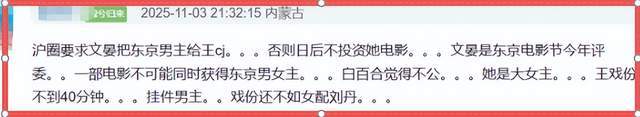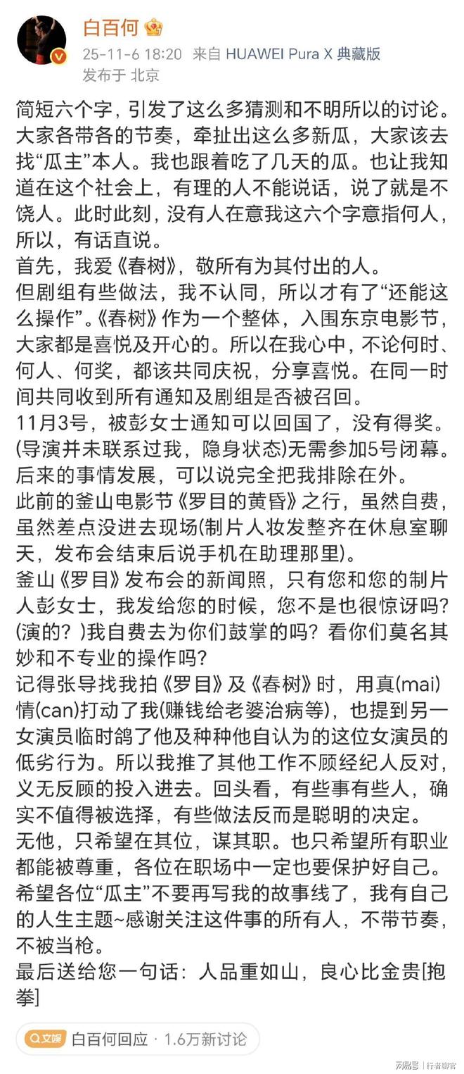 事件核心:从“委屈控诉”到“资本博弈”的罗生门 2025年11月3日,演员白百何在社交平台发布千字长文,直指《春树》剧组在东京电影节期间“集体孤立”自己。她透露,11月3日晚制片人突然通知其“没得奖可提前回国”,导致她缺席闭幕式红毯,而导演张律与演员王传君却现身领奖,甚至首映海报上自己的脸部被裁掉一半。白百何强调,自己为救场零片酬出演,垫付8万元机票酒店费用,却遭遇“卸磨杀驴”。