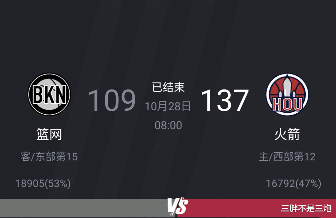 火箭:全队137分、总命中率57.6% 、三分命中率50.0%