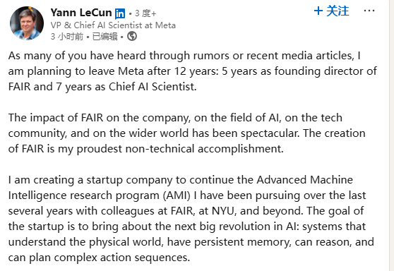 当地时间11月19日,身为Meta AI首席科学家且荣获图灵奖的杨立昆(Yann LeCun)在社交平台发布消息,称自己即将告别已效力12年的Meta,转而开启事业新征程——投身创业。