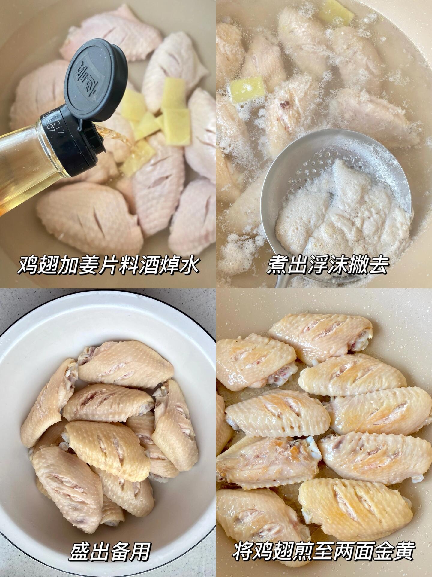 鸡翅预处理:鸡翅洗净,两面各划两刀(这样更容易入味)。冷水下锅,加入料酒和姜片,大火煮开后继续煮2分钟,捞出冲洗干净。这一步是去腥的关键,千万别省略哦!