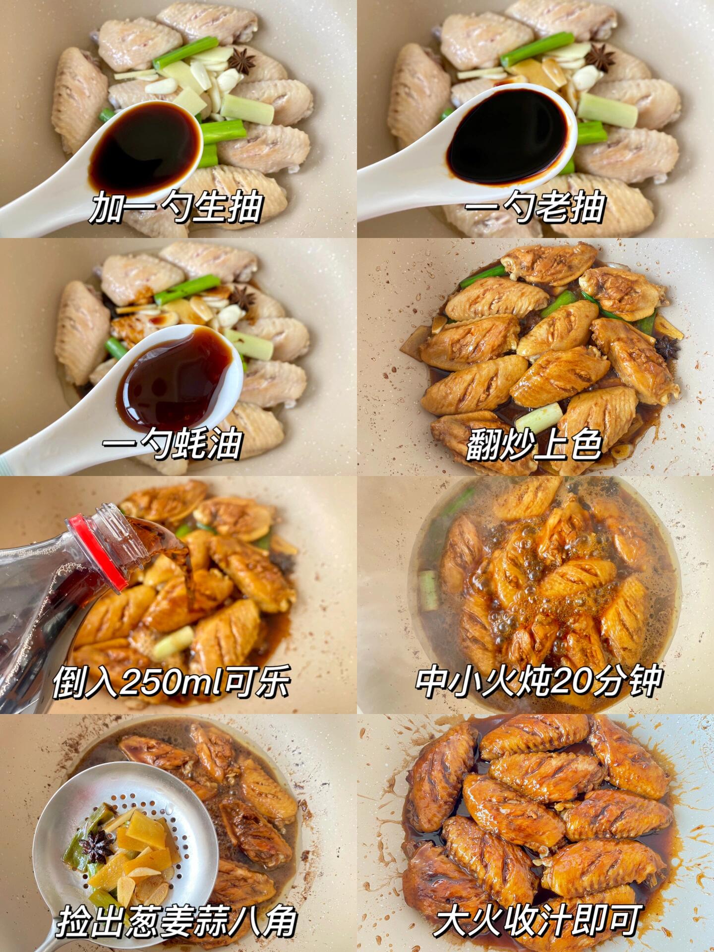 口味变化:喜欢辣口的可以在煎鸡翅时加入干辣椒;喜欢蒜香的可以在收汁前加入蒜末