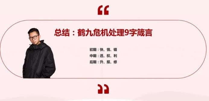 结合餐饮门店高频危机场景(如食品安全异物、顾客受伤、媒体暗访等),鹤九老师提炼出“危机处理9字箴言”: