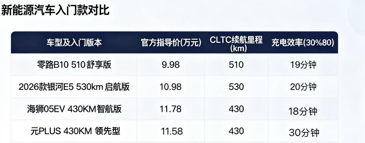 2026款银河E5的入门版本是530km启航版,指导价10.98万,海狮05 EV 2025款入门款为430KM智航版,指导价11.78万,元PLUS 2025款最低配是430KM领先型,官方定价11.58万,单看入门价格,零跑B10就低了很多,对于预算有限的家庭来说,这个差价就很关键了甚至覆盖一年电费跟保险钱还要多。