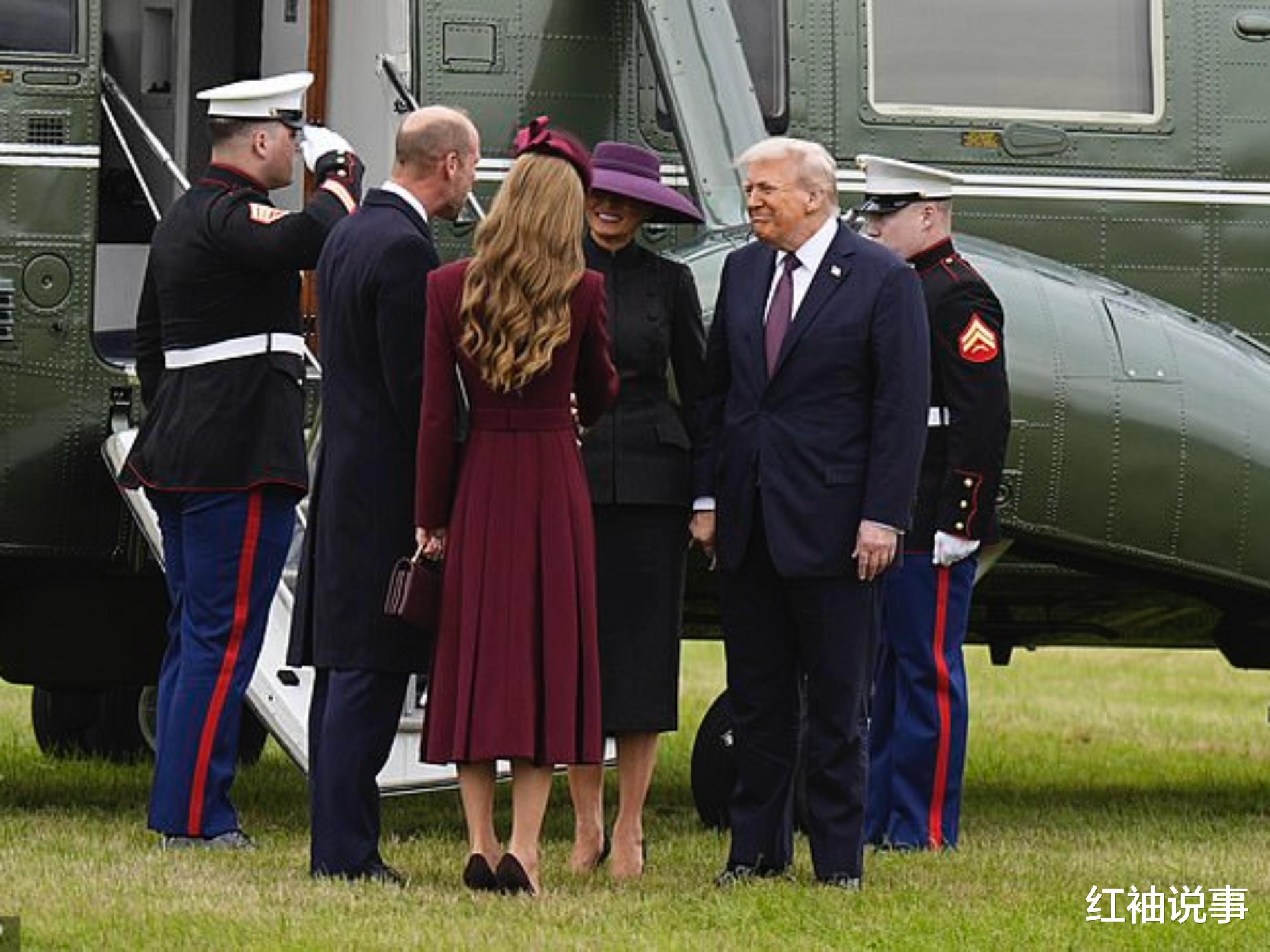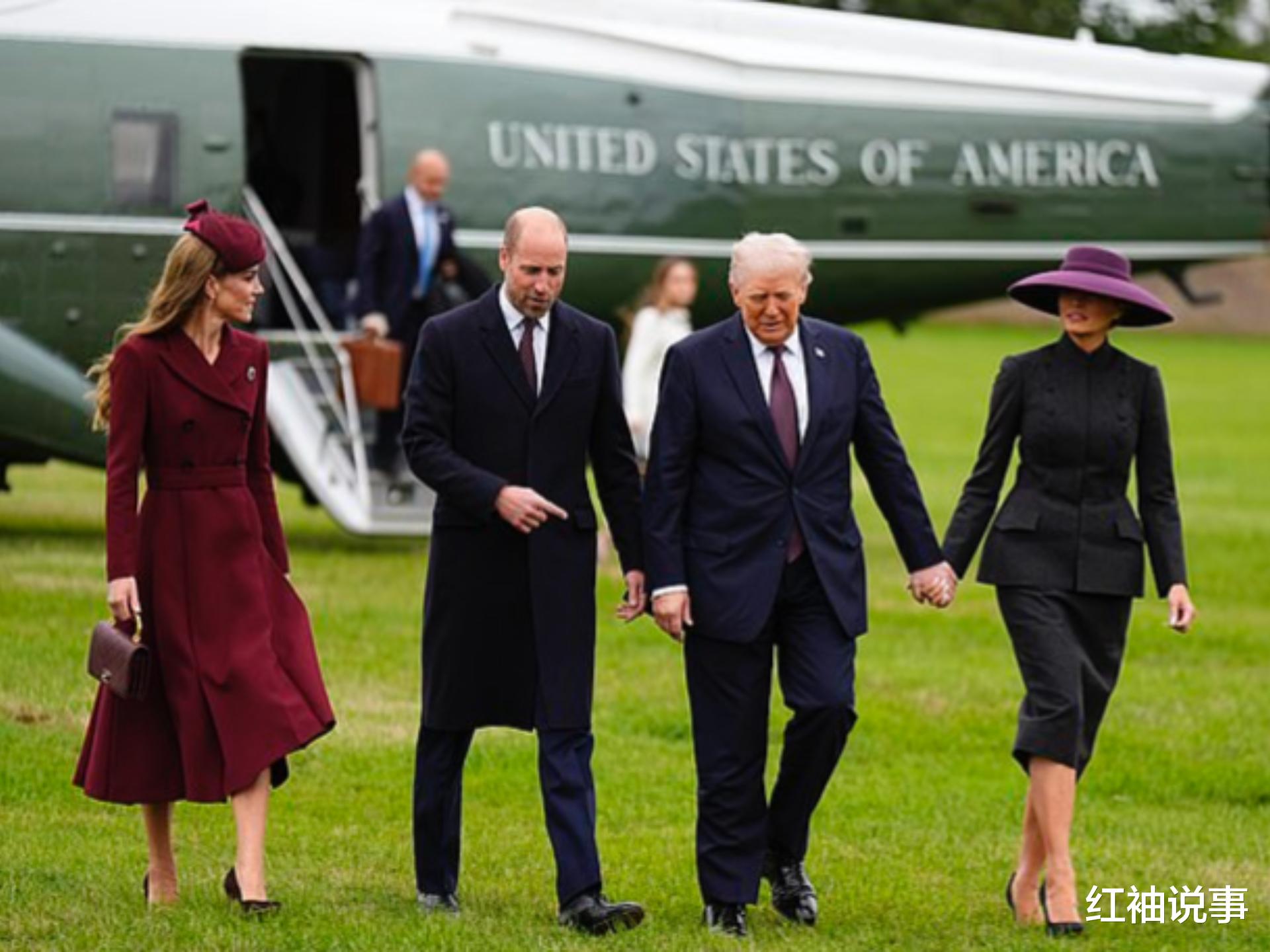 威廉王子与凯特护送特朗普总统和第一夫人穿过草地,来到维多利亚大厦外的碎石路,国王和王后正在那里等候。梅拉尼娅·特朗普与唐纳德、威廉王子和凯特王妃一起走在温莎庄园的围墙花园里,她熟练地穿着高跟鞋,步伐优雅自信。