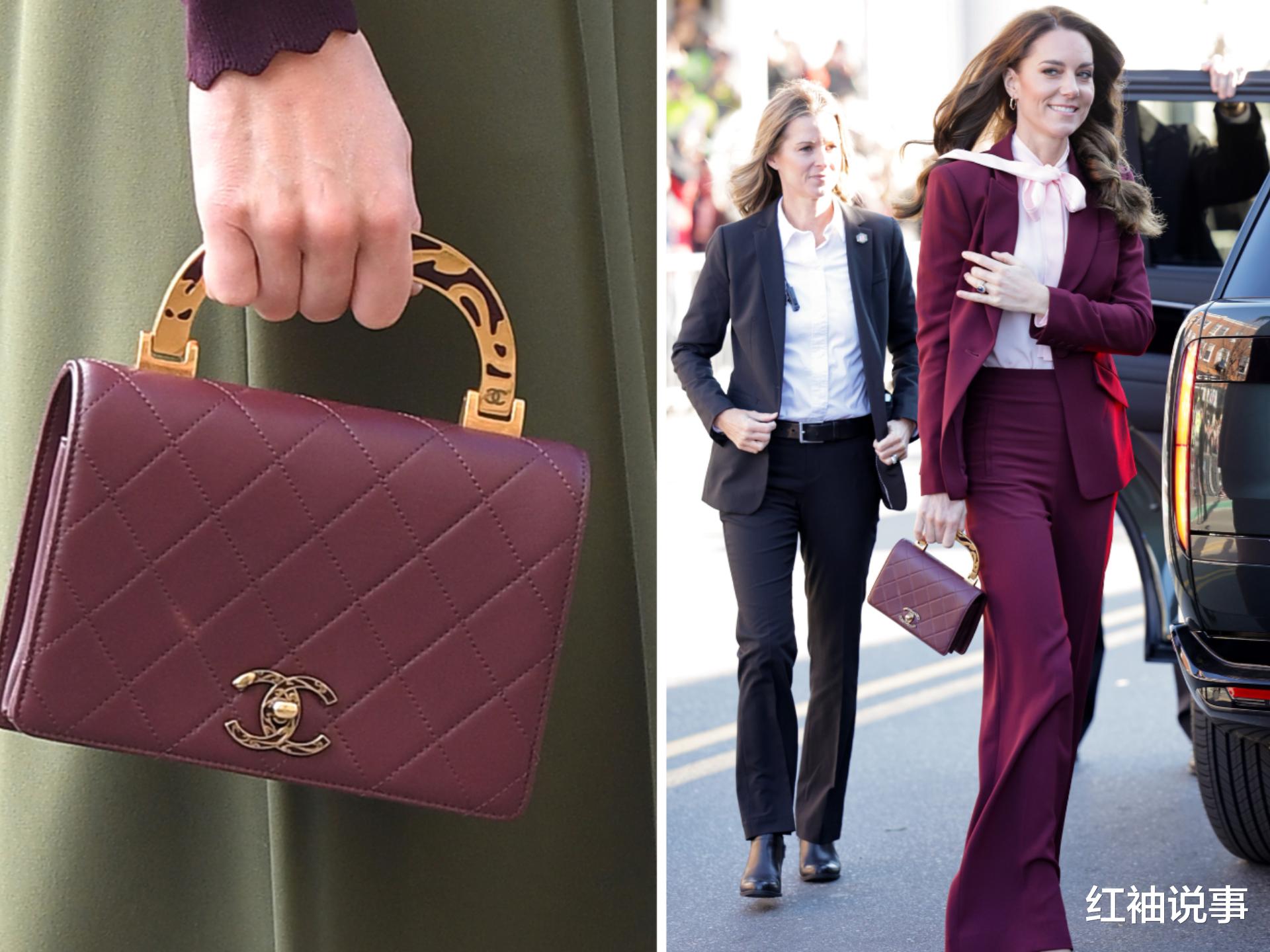 凯特手中拎着的酒红色香奈儿包,是她多次被人看到的经典搭配。这款包简约而不失时尚,与她的整体造型完美融合。除了手提包,她还佩戴了一对精致的红宝石耳环,在阳光下闪烁着迷人的光芒。