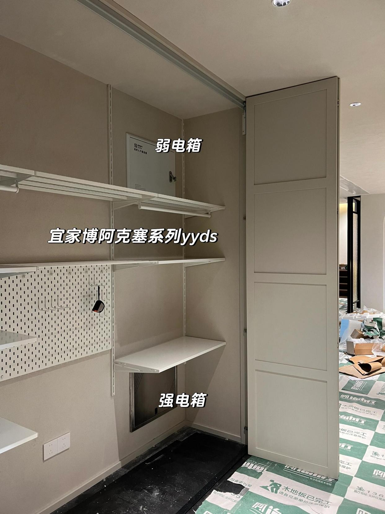 像网友@贺友直 家,直接拆墙做了一个超强的收纳柜, 他还整合了强弱电箱、地暖分水器,全部安排在这,里面金属系列,外面做成折叠门,关门平平整整,开门满满当当。